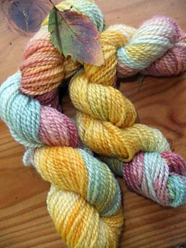The wool in these two skeins is Blue Faced Leicester - very soft with a slight lustre or sheen. After spinning the white tops I dyed the yarn in colours inspired by the Autumn Leaves which were starting to fall around me as I walked.